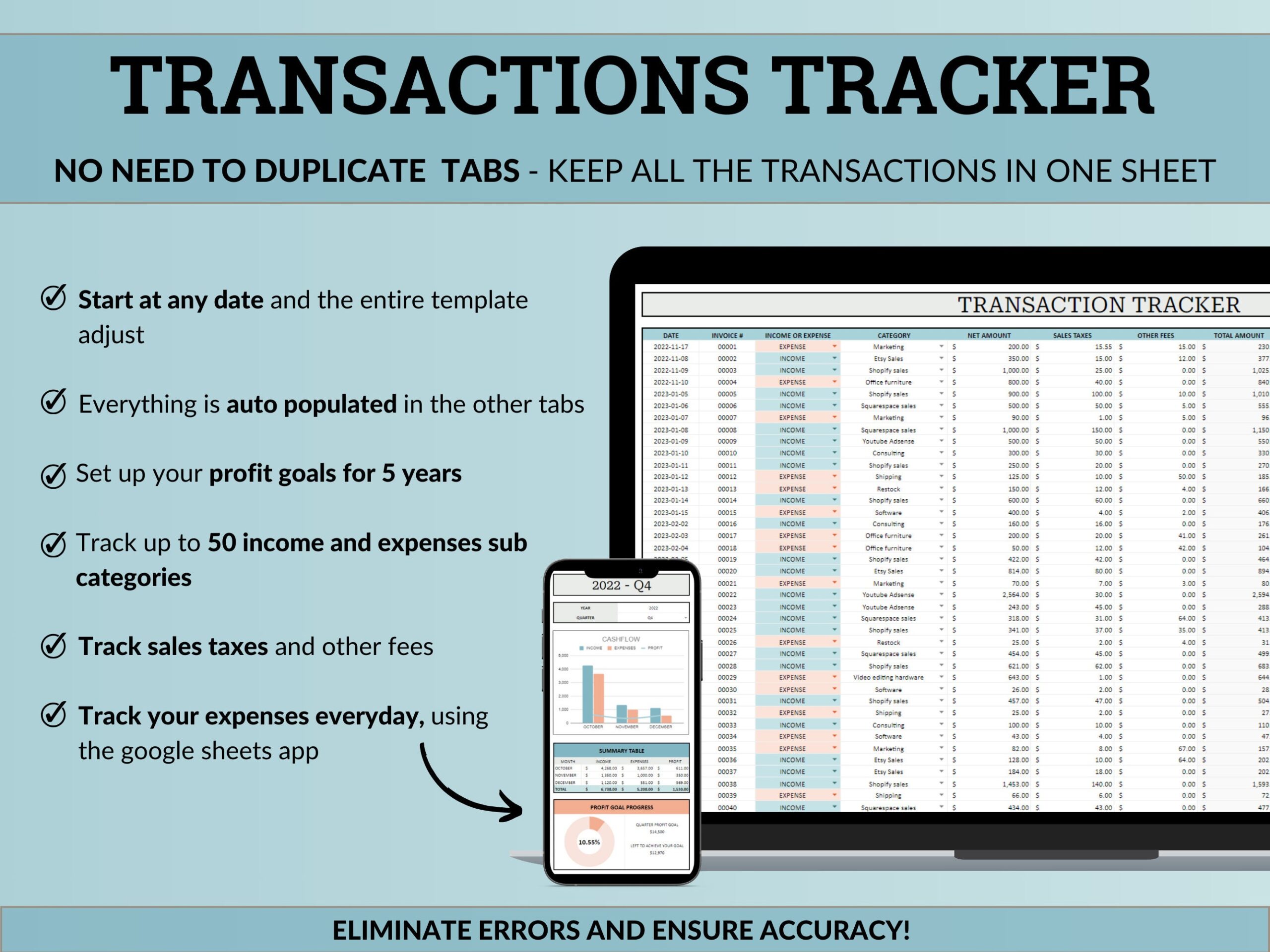 ✓ Transactions Tracker – where you will enter all your income and expenses