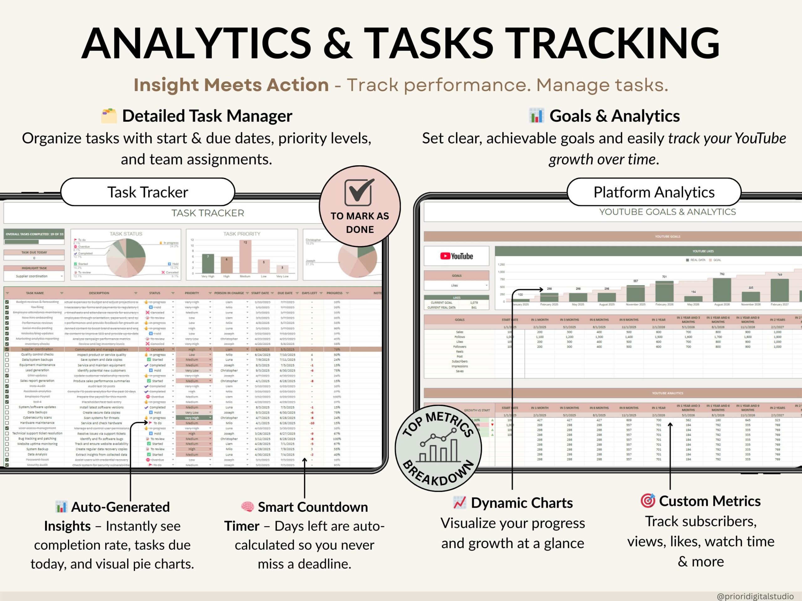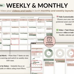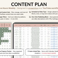This YouTube planner spreadsheet is perfect for content creators, vloggers, and social media managers who want to stay organized. Use it as a YouTube content calendar, video planner, social media tracker, or digital creator organizer. Works in Excel and Google Sheets for easy access anywhere. Plan videos, track uploads, manage collaborations, organize your brand identity, and grow your YouTube channel with this all-in-one content strategy template.
